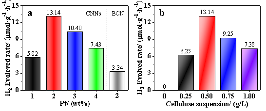 圖4.(a)CNNs樣品在不同Pt負載量條件下光催化重整纖維素制氫的平均速率;(b)CNNs樣品在在不同纖維素濃度條件下光催化重整纖維素制氫的平均速率