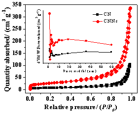 圖2.(a)CN和CNNs樣品的N2吸/脫附曲線(插圖:孔徑分布圖);(b)CN和CNNs樣品的FTIR圖