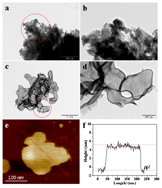 圖1.(a,b)CN(c,d)CNNs樣品的TEM和(e-f)CNNs樣品的AFM圖
