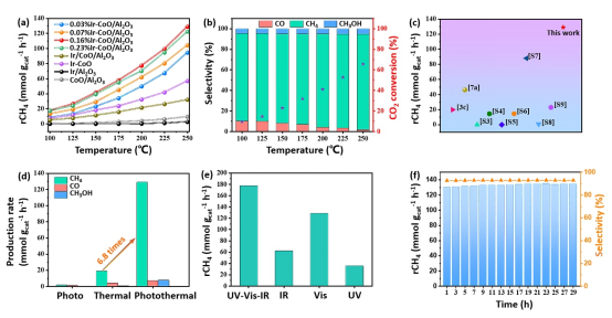 圖2、(a)催化劑在不同反應(yīng)溫度下的CH4產(chǎn)率;(b) 0.16%Ir-CoO/Al2O3催化劑在不同反應(yīng)溫度下的產(chǎn)物選擇性和CO2轉(zhuǎn)化率;(c)本工作與以往其他文獻(xiàn)中CH4產(chǎn)生速率的比較;(d) 0.16%Ir-CoO/Al2O3催化劑在不同條件下產(chǎn)物的產(chǎn)率;(e) 0.16%Ir-CoO/Al2O3催化劑在不同光照條件下的CH4產(chǎn)率;(f)穩(wěn)定性測(cè)試。
