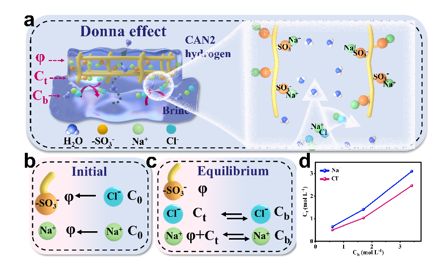 圖7:(a)唐南效應(yīng)誘導(dǎo)的高效耐鹽機(jī)理。(b)聚陰離子水凝膠層和鹽水的初始離子濃度。(c)聚陰離子水凝膠層和鹽水之間的唐南分布平衡。(d)進(jìn)入CAN水凝膠中Na+和Cl-濃度。