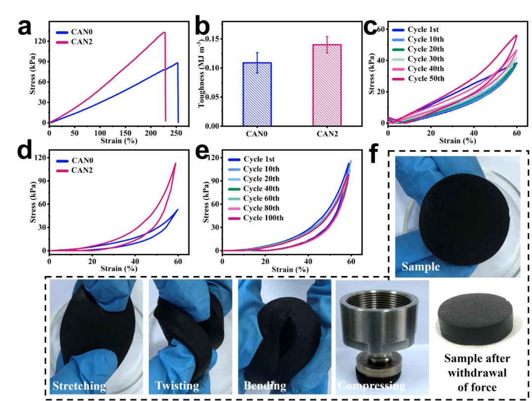 圖3:CAN0和CAN2水凝膠: (a-b) 拉伸的應(yīng)力-應(yīng)變曲線和韌性。 (c) CAN2水凝膠60%應(yīng)變下的拉伸循環(huán)的應(yīng)力-應(yīng)變曲線。 (d) CAN0和CAN2水凝膠的壓縮的應(yīng)力-應(yīng)變曲線。 (e) CAN2的壓縮循環(huán)的應(yīng)力-應(yīng)變曲線。 (f) 樣品圖片,樣品彎曲,拉伸,扭曲,壓縮圖片和撤去應(yīng)力后的樣品圖片。