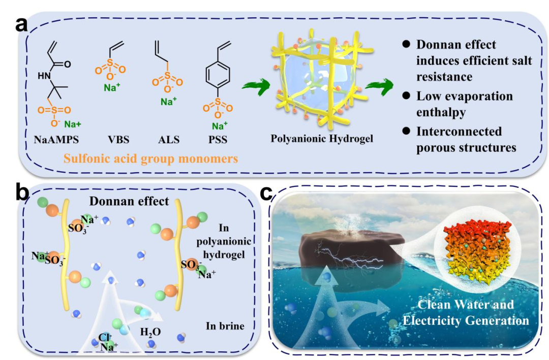 圖1:(a)陰離子水凝膠的成分和優(yōu)勢。(b)唐南效應(yīng)誘導(dǎo)的耐鹽機(jī)理。(c)水凝膠凈水和發(fā)電的示意圖。
