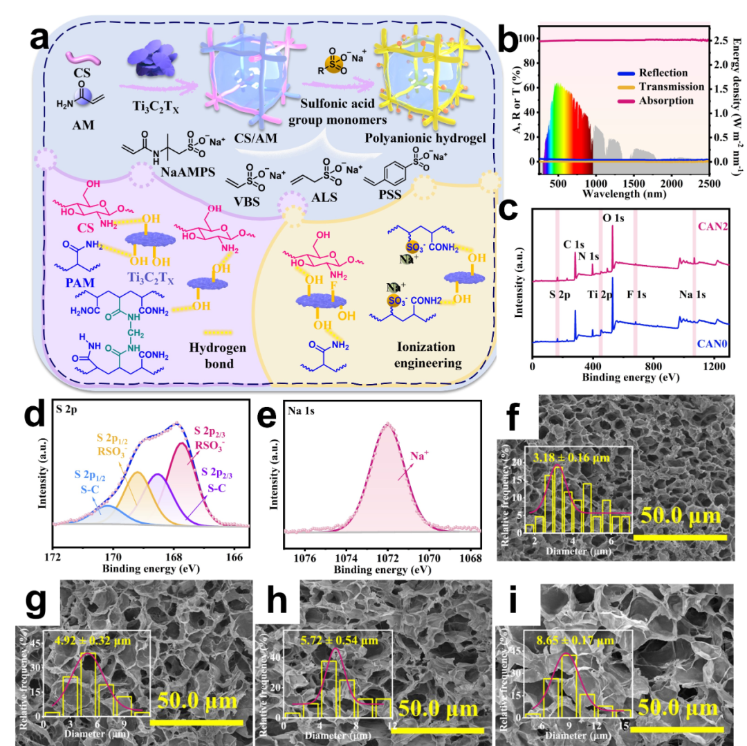 圖2:(a)負(fù)電性水凝膠的制備過程。(b) CAN2的吸收光譜。(c)CAN0和CAN2的XPS圖。CAN2的XPS圖: (d) S 2p,(e) Na 1s。(f-i)CAN0,CAN1,CAN2和CAN3的SEM圖。
