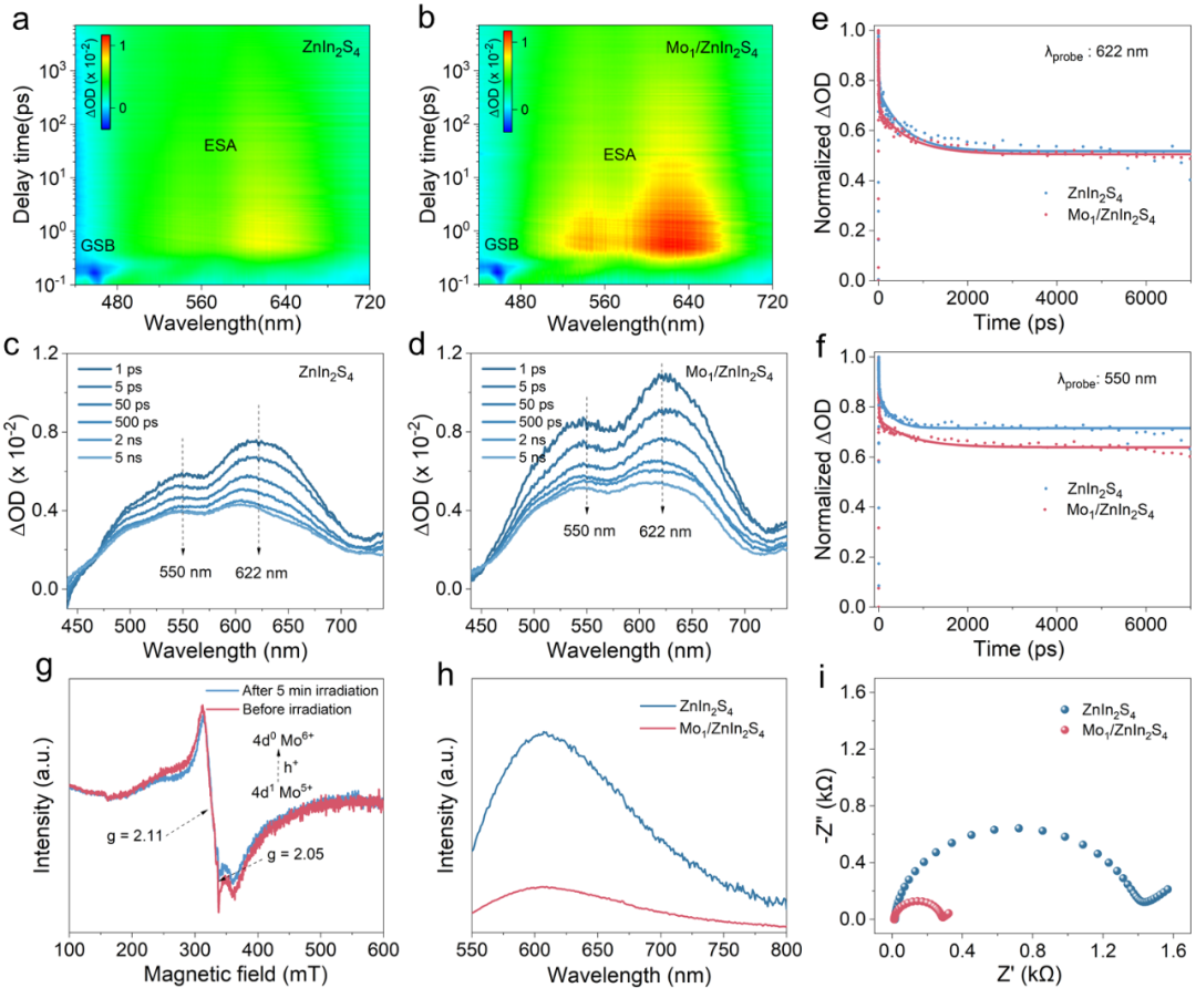 隨后,作者進行飛秒瞬態(tài)光譜測試,以深入理解光催化過程中的載流子動力學。ZnIn2S4和Mo1/ZnIn2S4在400 nm激發(fā)下,在550和622 nm處產(chǎn)生激發(fā)態(tài)吸收,分別歸因于捕獲態(tài)空穴和電子的信號(圖4a-d)。對550和622 nm處的信號進行擬合,結果表明Mo單原子分別提升空穴和電子的壽命1.2和2.6倍(圖4e,f)。進一步,原位輻照EPR圖譜顯示,Mo1/ZnIn2S4在光照下Mo5+的信號強度減少(圖4g),表明Mo位點捕獲光生空穴。PL光譜(圖4h)與阻抗圖(圖4i)表明Mo單原子有效抑制載流子復合和促進電子轉(zhuǎn)移。