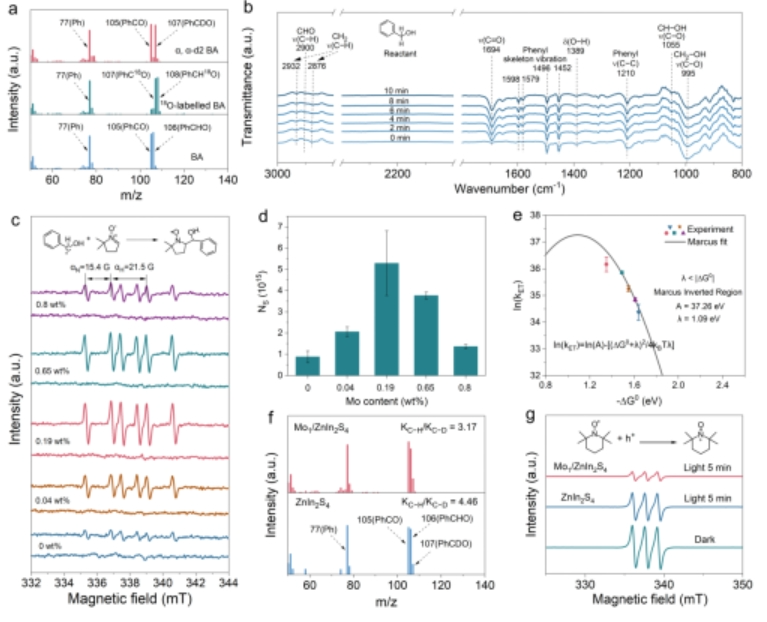 作者用α,α-d2 苯甲醇和18O標記苯甲醇進行質(zhì)譜實驗,證明溶劑中的H2O分子沒有參與反應(圖3a)。通過原位紅外實驗觀察到*PhCHOH中間物種的C–O伸縮振動峰(圖3b),表明苯甲醇是先斷裂C–H,再斷裂O–H鍵。作者用DMPO作為自由基捕獲劑,在不同Mo含量的Mo1/ZnIn2S4樣品中均觀察到DMPO–PhCHOH加合物的信號(圖3c)。對信號進行二次積分計算出自旋數(shù)(Ns)(圖3d),即為DMPO–PhCHOH的生成量。因為C–H鍵需要轉(zhuǎn)移一個電子到催化劑上才能形成一個DMPO–PhCHOH分子,因此獲得的Ns等價于C–H鍵的電子轉(zhuǎn)移數(shù),進而計算出C–H鍵電子轉(zhuǎn)移速率。作者通過同步輻射價帶譜確定不同Mo含量的Mo1/ZnIn2S4對苯甲醇氧化的空穴驅(qū)動力,并將驅(qū)動力與C–H鍵電子轉(zhuǎn)移速率代入到Marcus等式中(圖3e),發(fā)現(xiàn)C–H鍵活化位于Marcus反轉(zhuǎn)區(qū),即驅(qū)動力減少,電子轉(zhuǎn)移速率增大。作者用等量的苯甲醇和α,α-d2 苯甲醇作為反應物進行動力學同位素效應(KIE)測試(圖3f),發(fā)現(xiàn)在Mo1/ZnIn2S4上KIE從4.46減小到3.17(圖3f),說明Mo單原子有利于C–H的活化。用TEMP作為空穴的探針分子,EPR結果表明Mo1/ZnIn2S4能夠產(chǎn)生更多的光生空穴(圖3g)。