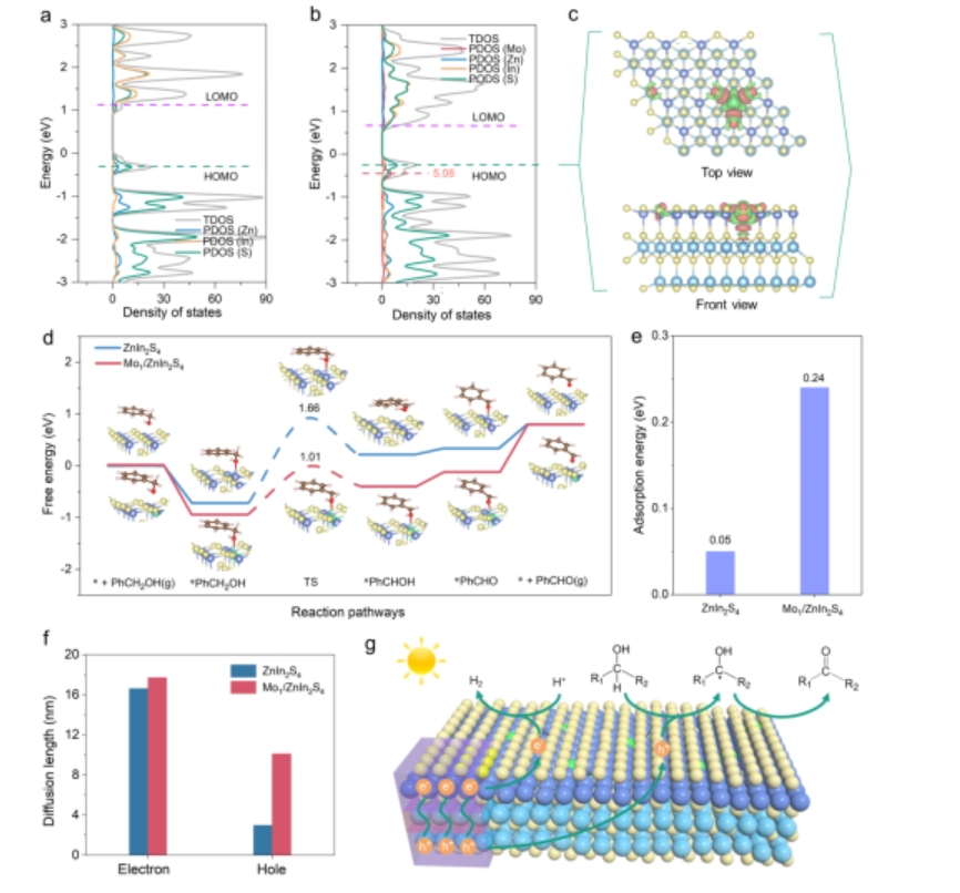 作者通過分子軌道分析,進一步探究了Mo單原子對電子結構的影響。ZnIn2S4和Mo1/ZnIn2S4的PDOS分析表明(圖5a和5b),Mo在HOMO引入新的分子軌道,表明Mo參與ZnIn2S4價帶頂?shù)臉嬓?,從而能夠?qū)昭ǖ尿?qū)動力進行調(diào)控。Bader電荷計算顯示(圖5c),更多的電子集中在S原子上,這表明Mo位點傾向于富集空穴,從而驅(qū)動醇的無受體脫氫反應。吉布斯自由能計算結果表明原子級分散的Mo活性位點具有雙重作用:不僅能顯著降低C–H鍵斷裂的能壘,還可穩(wěn)定*PhCHOH中間體以促進后續(xù)O–H鍵斷裂的過程。根據(jù)霍爾效應測試和有效質(zhì)量計算結果,作者得到ZnIn2S4和Mo1/ZnIn2S4的載流子擴散長度(圖5f),發(fā)現(xiàn)Mo1/ZnIn2S4的空穴擴散長度提升了3.4倍,這確保了光生空穴能夠有效遷移至Mo活性位點。