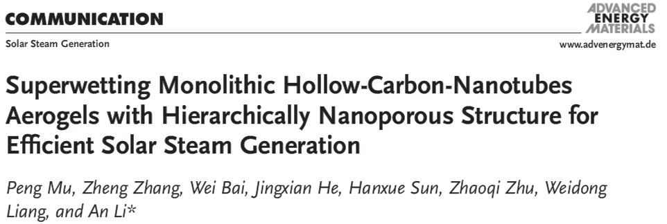 近日,蘭州理工大學(xué)石油化工學(xué)院李安研究團(tuán)隊(duì),在能源材料領(lǐng)域國(guó)際權(quán)威期刊《先進(jìn)能源材料》(Advanced Energy Materials,最新影響因子21.875)上在線發(fā)表了題為“Superwetting Monolithic Hollow-Carbon-Nanotubes Aerogels with Hierarchically Nanoporous Structure for Efficient Solar Steam Generation”的全新研究成果。