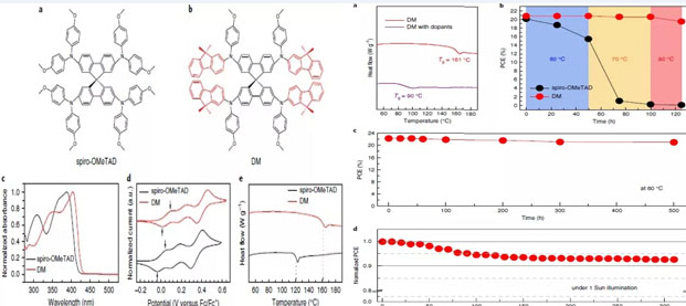 韓國化學(xué)技術(shù)研究所(KRICT)的Jaemin Lee教授等人發(fā)展了一種命名為DM的氟端空穴傳輸材料,并且制備出了效率突破至23.2%的高效穩(wěn)定鈣鈦礦太陽能電池,并且具有良好的環(huán)境穩(wěn)定性。這為推動鈣鈦礦太陽能電池的進一步發(fā)展做出重要貢獻。