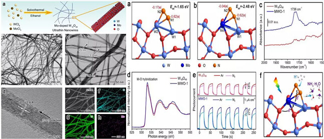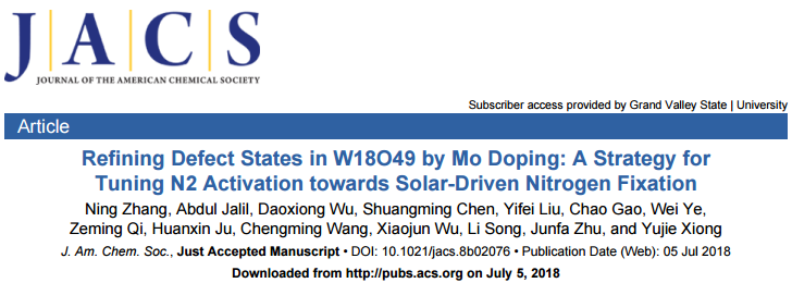 Zhang N, Jalil A, Wu D, et al. Refining Defect States in W18O49 by Mo Doping: A Strategy for Tuning N2 Activation towards Solar-Driven Nitrogen Fixation[J]. Journal of the American Chemical Society, 2018.