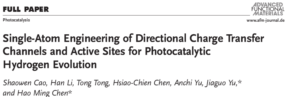 Cao S, Li H, Tong T, et al. Single‐Atom Engineering of Directional Charge Transfer Channels and Active Sites for Photocatalytic Hydrogen Evolution[J]. Advanced Functional Materials, 2018: 1802169.
