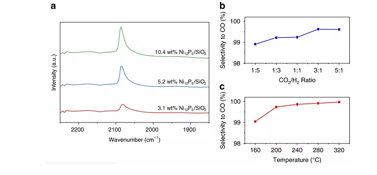 近期,中山大學(xué)匡代彬教授和多倫多大學(xué)Geoffrey A. Ozin教授(共同通訊作者)首次報道了金屬磷化物可作為一種高活性、選擇性、穩(wěn)定性的光催化二氧化碳加氫催化劑。研究以磷化鎳(Ni12P5)為原型,這一磷化物的結(jié)構(gòu)建立在將高分散鎳納米簇集成到磷晶格中的基礎(chǔ)上,可以在整個太陽光光譜范圍高度富集光能。由于該化合物具有獨特的線性鍵合的鎳-羰基占主導(dǎo)的反應(yīng)路徑,磷化鎳被發(fā)現(xiàn)是一種光熱催化劑,可實現(xiàn)逆水煤氣變換反應(yīng),一氧化碳的生產(chǎn)速率為960?±?12?mmol?gcat?1?h?1,選擇性近乎100%,同時還具有長期穩(wěn)定性。不僅如此,磷化鈷也被發(fā)現(xiàn)具有相似的特性,這說明金屬磷化物可作為具有高速率和選擇性的光熱二氧化碳催化劑。