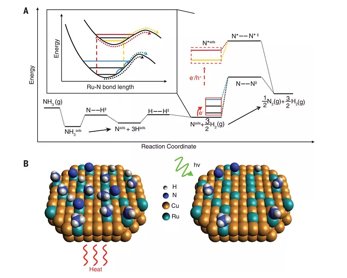 在以等離子體金屬納米顆粒為代表的催化劑發(fā)揮光熱催化效果時,產(chǎn)生熱電荷載流子可活化反應(yīng)物、并降低反應(yīng)的總能壘。然而,在這過程中的熱和電子激發(fā)的關(guān)系尚不清楚。針對這一問題,萊斯大學(xué)的Peter Nordlander和Naomi J. Halas[3]等人通過研究氨氣分解來分析光和熱激發(fā)的作用。在銅合金納米構(gòu)造中,通過吸收光產(chǎn)生電子可活化在釕表面原子上的氮原子。通過測量不同波長、光強(qiáng)和催化劑表面溫度下的反應(yīng)速率,可以定量表觀活化能壘,厘清熱載流子的作用,并為設(shè)計高效光催化劑奠定了基礎(chǔ)。