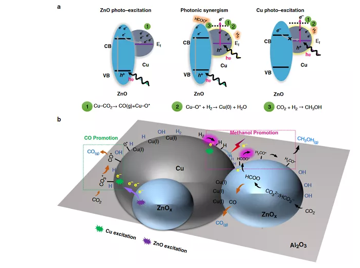 盡管光激發(fā)已經(jīng)被用于解鎖熱催化的低溫平衡機(jī)制,電子激發(fā)和表面化學(xué)過程之間相互作用機(jī)制依然不是很清楚。在這個問題上,新南威爾士大學(xué)的Jason Scott和Rose Amal(共同通訊作者)報道了一種聯(lián)合的氧化鋅帶隙激發(fā)/銅等離子激元激發(fā)的策略,可以協(xié)同提高銅/氧化鋅/氧化鋁(CZA)催化劑銅-氧化鋅界面的甲醇產(chǎn)率。而相反地,選擇性激發(fā)單一組分只能導(dǎo)致一氧化碳產(chǎn)率提高。通過改變表面銅氧化態(tài)和鋅局部電子結(jié)構(gòu),從氧化鋅激發(fā)和銅等離子激發(fā)的電子能夠活化表面被吸附物,催化關(guān)鍵基本反應(yīng)過程(即甲酸轉(zhuǎn)變和氫分子活化),從而可解釋聯(lián)合策略中表現(xiàn)出的光熱活性現(xiàn)象。這些發(fā)現(xiàn)為光熱雙活化下CZA表面發(fā)生的反應(yīng)提供了極具價值的理解。