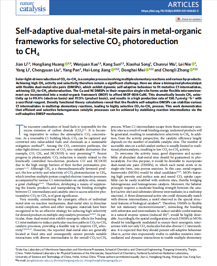 標(biāo)題:Self-adaptive dual-metal-site pairs in metal-organic frameworks for selective CO2 photoreduction to CH4