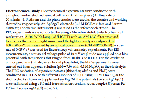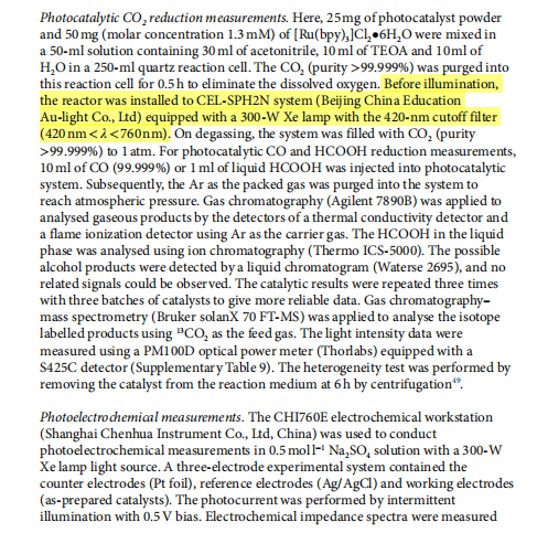 5. 正文中標(biāo)記了“A 500W Xe lamp (AULIGHT) with an AM 1.5G filter was used to serve as the reaction light source and the light intensity was adjusted to 100mWcm–2, as measured by an optical power meter (CEL-NP2000-10)”. 支持材料里(SI)提供了: “Incident photon to current conversion efficiency (IPCE) was collected under light from a 500 W xenon lamp through a monochromator(CEL-SPEC)”.