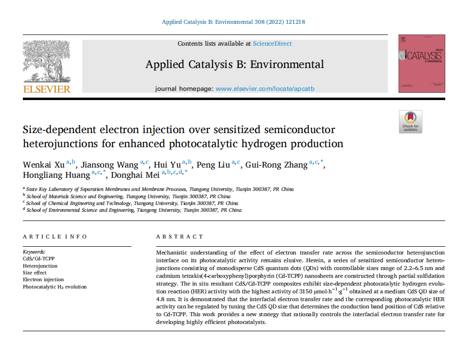 文章DOI : https://doi.org/10.1016/j.apcatb.2022.121218,原文鏈接:Size-dependent electron injection over sensitized semiconductor heterojunctions for enhanced photocatalytic hydrogen production