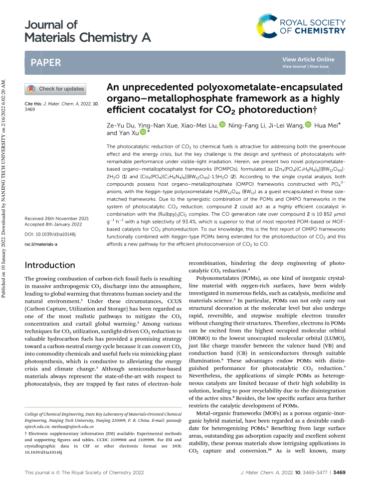 標題:An unprecedented polyoxometalate-encapsulated organo–metallophosphate framework as a highly efficient cocatalyst for CO2 photoreduction