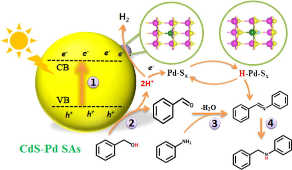 隨著工業(yè)的發(fā)展與進(jìn)步,有機(jī)胺廣泛應(yīng)用于農(nóng)業(yè)、醫(yī)藥、家居、軍工等領(lǐng)域,其合成在工業(yè)生產(chǎn)中有著越來越明顯的重要性。基于“借氫機(jī)制(氫轉(zhuǎn)移)”,通過胺與醇的C-N偶聯(lián)被認(rèn)為是一種較為綠色的合成有機(jī)胺的理想路徑。這一過程主要包含醇的脫氫、亞胺的生成以及亞胺的加氫這三個(gè)主要步驟。其中醇的脫氫是整個(gè)反應(yīng)的決速步驟。然而,基于這一機(jī)制,在熱催化合成有機(jī)胺的過程中存在一些缺點(diǎn):(1)醇的脫氫決速步驟需要較苛刻的條件(高溫高壓);(2)易發(fā)生過度偶聯(lián),使得產(chǎn)物分布廣,不利于分離;(3)反應(yīng)中使用的催化劑多為高負(fù)載量的負(fù)載型貴金屬催化劑(如Ru/Al2O3、Pd/Al2O3、Rh/Al2O3等),成本較高。因此,開發(fā)出高效低成本的催化劑具有一定的挑戰(zhàn)性。近年來,利用光氧化還原技術(shù)實(shí)現(xiàn)常溫常壓條件下有機(jī)胺的合成引起了廣泛的關(guān)注。研究者們通常采用一些貴金屬有機(jī)配合物分子進(jìn)行均相催化反應(yīng),但反應(yīng)后催化劑難以進(jìn)行分離,在實(shí)際工業(yè)生產(chǎn)中難以大規(guī)模應(yīng)用。而采用傳統(tǒng)的半導(dǎo)體光催化劑進(jìn)行多相催化反應(yīng),則可以有效解決這一難題。然而僅僅依靠半導(dǎo)體本身的催化能力,很難達(dá)到較高的催化活性,實(shí)際應(yīng)用過程中往往需要通過負(fù)載一些助催化劑或表面修飾來提高催化性能。近些年,單原子催化被認(rèn)為是較有前景的領(lǐng)域。單原子催化劑由于其獨(dú)特的電子結(jié)構(gòu)和較高的原子利用效率而表現(xiàn)出優(yōu)異的催化活性,被廣泛應(yīng)用于光催化水分解制氫、二氧化碳還原、固氮和有機(jī)物降解等領(lǐng)域。因此,我們課題組設(shè)計(jì)開發(fā)了一種單原子光催化劑CdS-Pd,該催化劑可以有效地用于可光催化苯甲醇和苯胺的C-N偶聯(lián)反應(yīng),獲得具有工業(yè)應(yīng)用價(jià)值的二級胺。同時(shí)反應(yīng)過程中釋放出清潔能源氫氣。這一工作將為溫和條件下實(shí)現(xiàn)C-N偶聯(lián)反應(yīng)提供一種新的途徑。