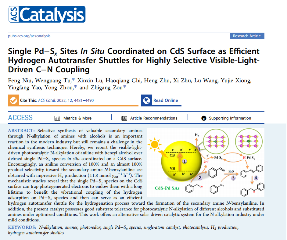 標(biāo)題:Single Pd-Sx Sites In Situ Coordinated on CdS Surface as Efficient Hydrogen Autotransfer Shuttles for Highly Selective Visible-Light-Driven C-N Coupling