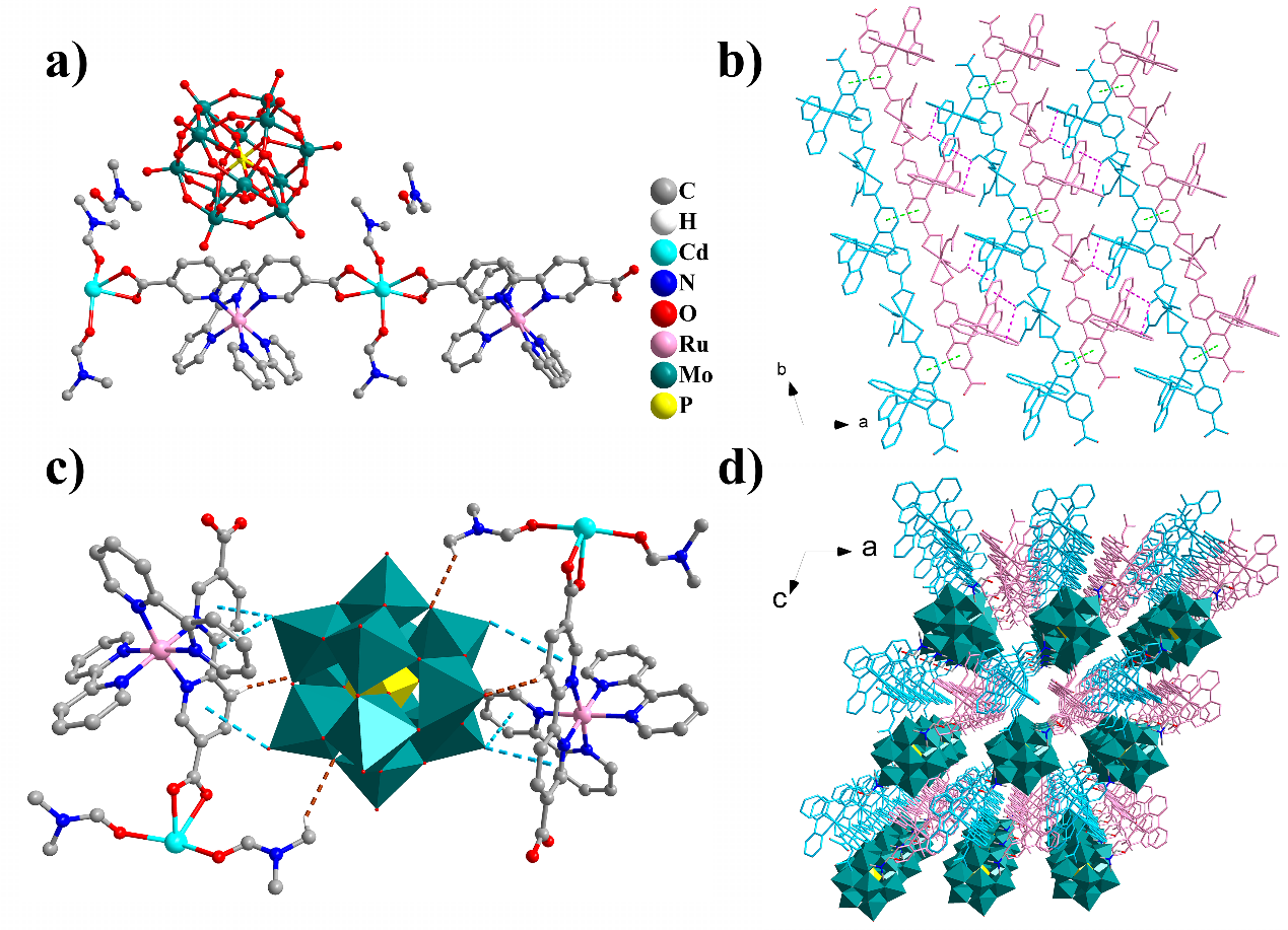全文速覽 光催化技術(shù)被廣泛研究,但需要解決兩個(gè)關(guān)鍵問題,即陽光利用率低和載流子復(fù)合率高。在本工作中,我們將金屬配體[Ru(bpy)2(H2dcbpy)]Cl2和多金屬氧酸鹽(POMs)組裝到一起,得到了兩例POM基金屬有機(jī)框架(POMOFs)材料:{[Cd(DMF)2Ru(bpy)2(dcbpy)]2(POMs)(DMF)2}·xDMF (PMo-1,POMs=[PMoVI11MoVO40]4?,x=5;SiW-2,POMs=[SiW12O40]4?,x=4)。這種組裝不僅增強(qiáng)了光吸收,而且提高了載流子分離效率,在此基礎(chǔ)上,兩種POMOFs對(duì)光催化芐胺氧化偶聯(lián)反應(yīng)都表現(xiàn)出了高活性。在PMo-1催化下反應(yīng)在30分鐘內(nèi)就能完成,亞胺產(chǎn)率為99.6%,且轉(zhuǎn)化頻率(TOF)高達(dá)6631.6 h?1。據(jù)我們所知,PMo-1的催化活性優(yōu)于此前報(bào)道的任何其他光催化劑,他們的TOF通常小于2000 h?1。