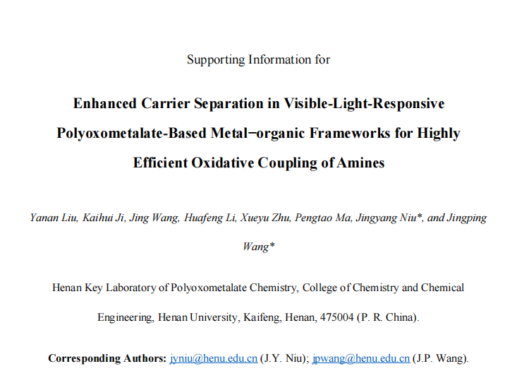標(biāo)題:Enhanced Carrier Separation in Visible-Light-Responsive Polyoxometalate-Based Metal–Organic Frameworks for Highly Efficient Oxidative Coupling of Amines