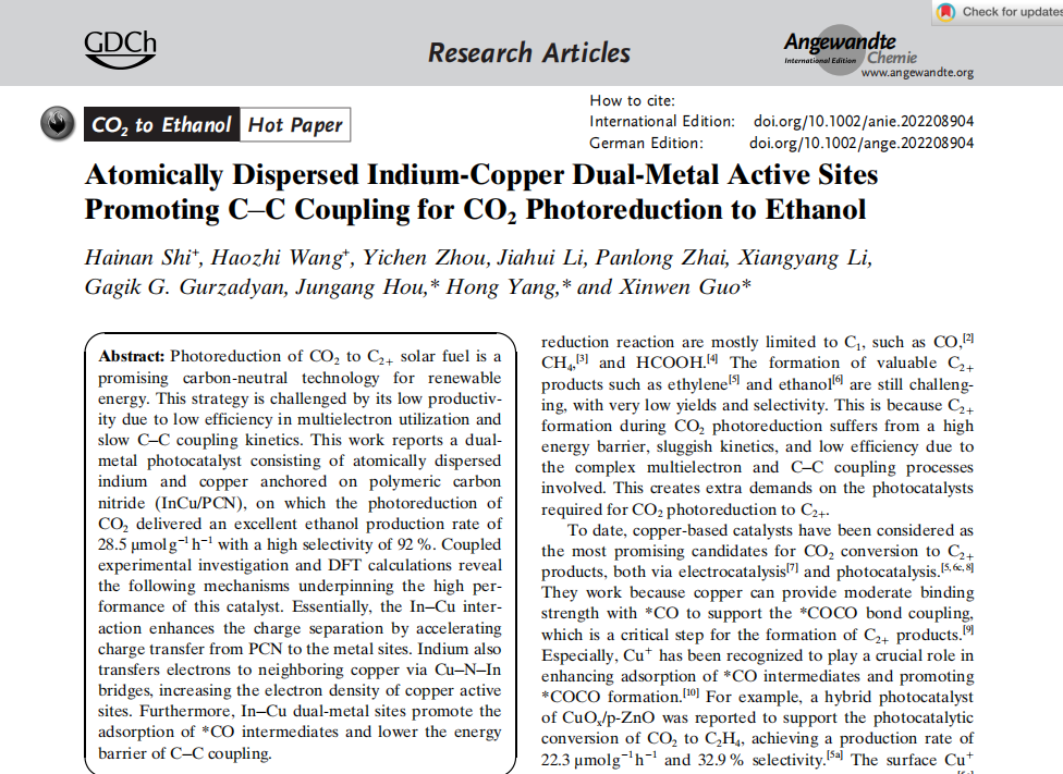 標題: Atomically Dispersed Indium-Copper Dual-Metal Active Sites Promoting C?C Coupling for CO2 Photoreduction to Ethanol