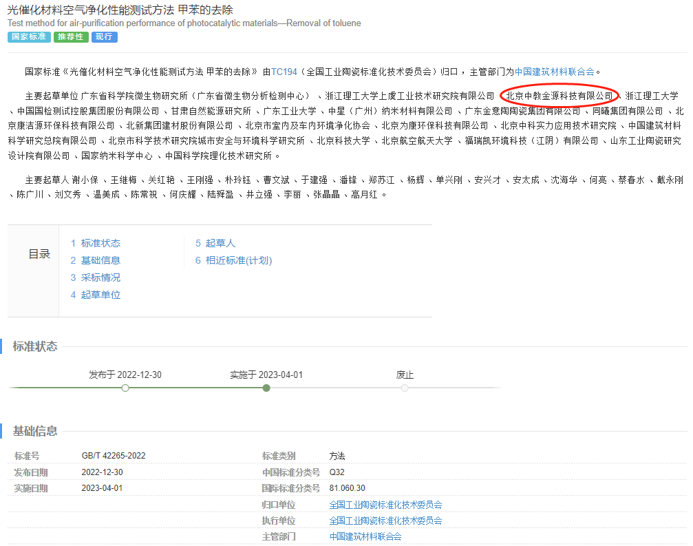 國(guó)家標(biāo)準(zhǔn)《光催化材料空氣凈化性能測(cè)試方法 甲苯的去除》 由TC194(全國(guó)工業(yè)陶瓷標(biāo)準(zhǔn)化技術(shù)委員會(huì))歸口 ,主管部門(mén)為中國(guó)建筑材料聯(lián)合會(huì)。