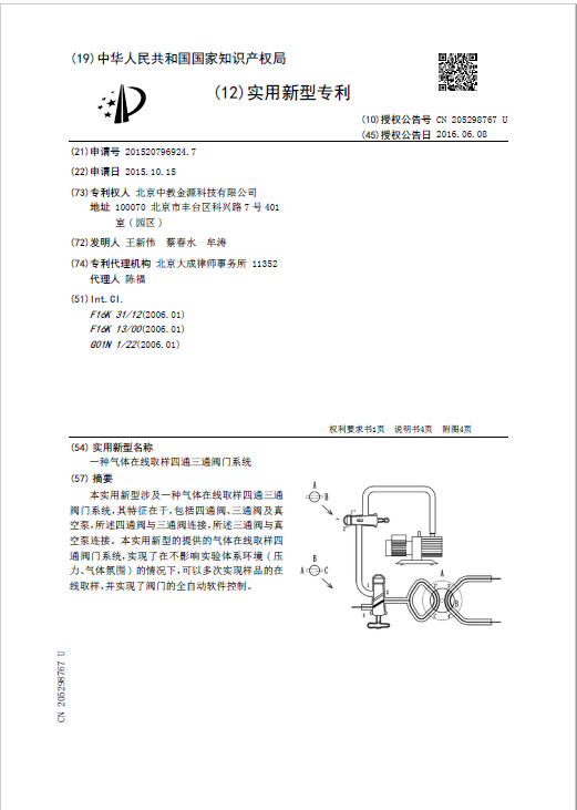 本實用新型涉及一種氣體在線取樣四通三通閥門系統(tǒng),其特征在于,包括四通閥、三通閥及真空泵,所述四通閥與三通閥連接,所述三通閥與真空泵連接。本實用新型的提供的氣體在線取樣四通閥門系統(tǒng),實現(xiàn)了在不影響實驗體系環(huán)境(壓力、氣體氛圍)的情況下,可以多次實現(xiàn)樣品的在線取樣,并實現(xiàn)了閥門的全自動軟件控制。