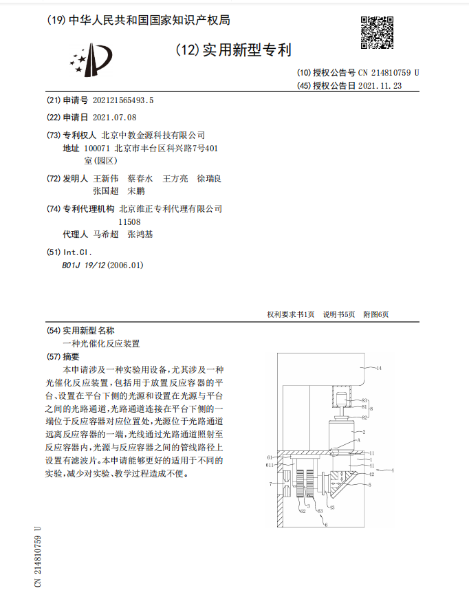 本申請涉及一種實驗用設(shè)備,尤其涉及一種 光催化反應(yīng)裝置,包括用于放置反應(yīng)容器的平 臺、設(shè)置在平臺下側(cè)的光源和設(shè)置在光源與平臺 之間的光路通道,光路通道連接在平臺下側(cè)的一 端位于反應(yīng)容器對應(yīng)位置處,光源位于光路通道 遠離反應(yīng)容器的一端,光線通過光路通道照射至 反應(yīng)容器內(nèi),光源與反應(yīng)容器之間的管線路徑上 設(shè)置有濾波片。本申請能夠更好的適用于不同的 實驗,減少對實驗、教學過程造成不便。