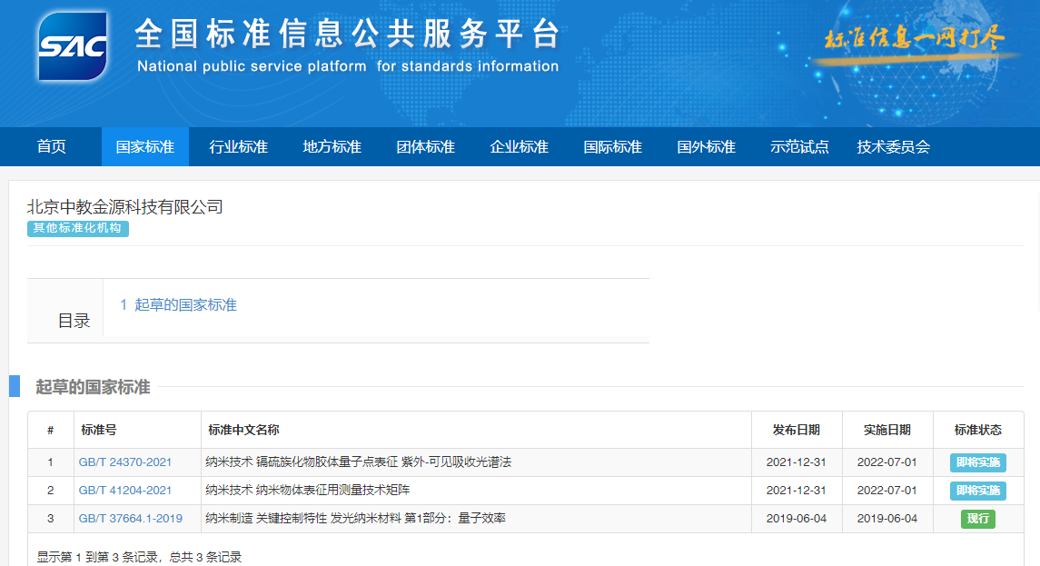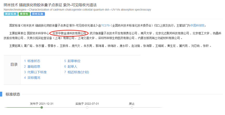 2021-12-31日由國家納米科學(xué)中心 、北京中教金源科技有限公司 等起草的國家標(biāo)準(zhǔn)《納米技術(shù) 鎘硫族化物膠體量子點(diǎn)表征 紫外-可見吸收光譜法成功發(fā)布,并于2022-07-01起正式實(shí)施。