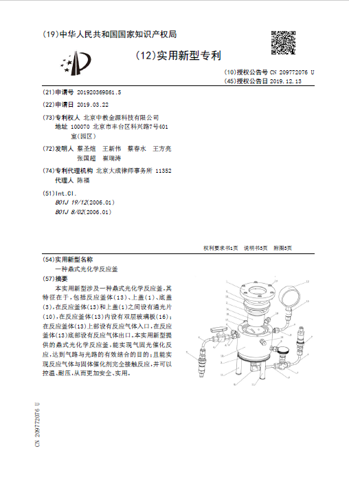 本實(shí)用新型涉及一種鼎式光化學(xué)反應(yīng)釜,其特征在于,包括反應(yīng)釜體(13)、上蓋(1)、底蓋(3),在反應(yīng)釜體(13)和上蓋(1)之間設(shè)有通光片(10),在反應(yīng)釜體(13)內(nèi)設(shè)有雙層玻璃板(16);在反應(yīng)釜體(13)上部設(shè)有反應(yīng)氣體入口,在反應(yīng)釜體(13)底部設(shè)有反應(yīng)氣體出口。本實(shí)用新型提供的鼎式光化學(xué)反應(yīng)釜,能實(shí)現(xiàn)氣固光催化反應(yīng),達(dá)到氣路與光路的有效結(jié)合的目的;且能實(shí)現(xiàn)反應(yīng)氣體與固體催化劑完全接觸反應(yīng),并可以控溫、耐壓,從而更加安全、實(shí)用。