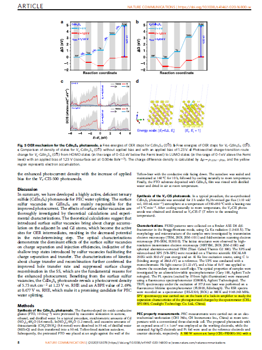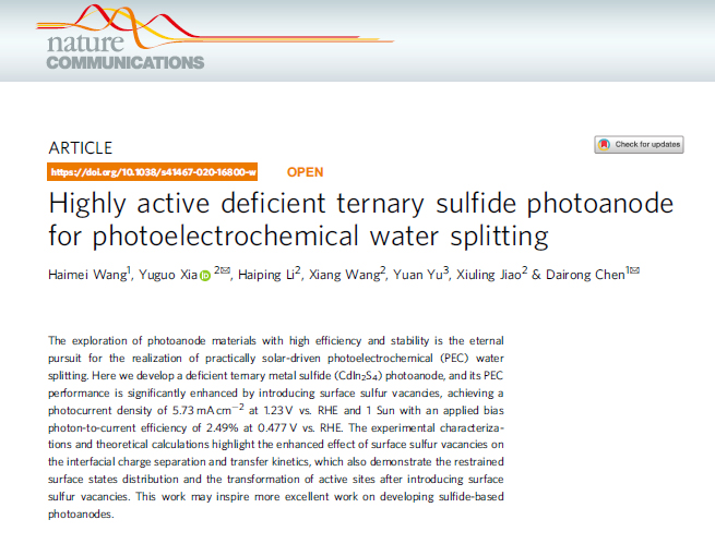 近日,我院陳代榮教授課題組在缺陷態(tài)金屬硫化物基光電陽極材料研究領域取得了重要進展。相關成果以“Highly active deficient ternary sulfide photoanode for photoelectrochemical water splitting” 為題,發(fā)表在國際知名期刊 Nature communications (IF=12.19) (DOI: 10.1038/s41467-020-16800-w)。2018級博士研究生王海梅為本文第一作者,夏玉國高級實驗師和陳代榮教授為本文的共同通訊作者,山東大學為唯一完成單位。
