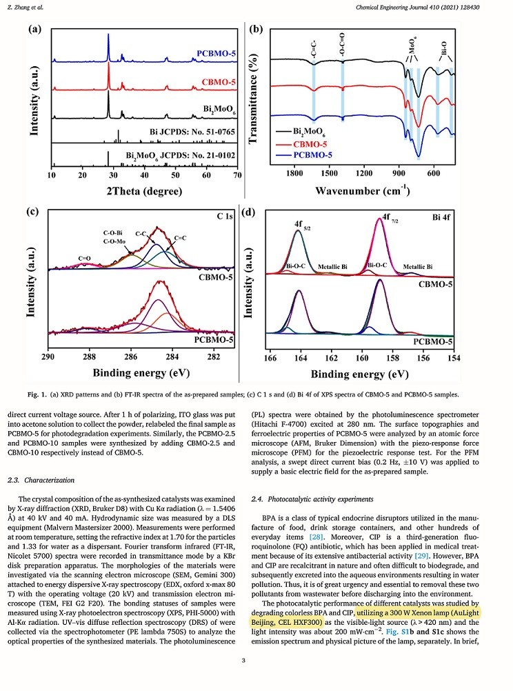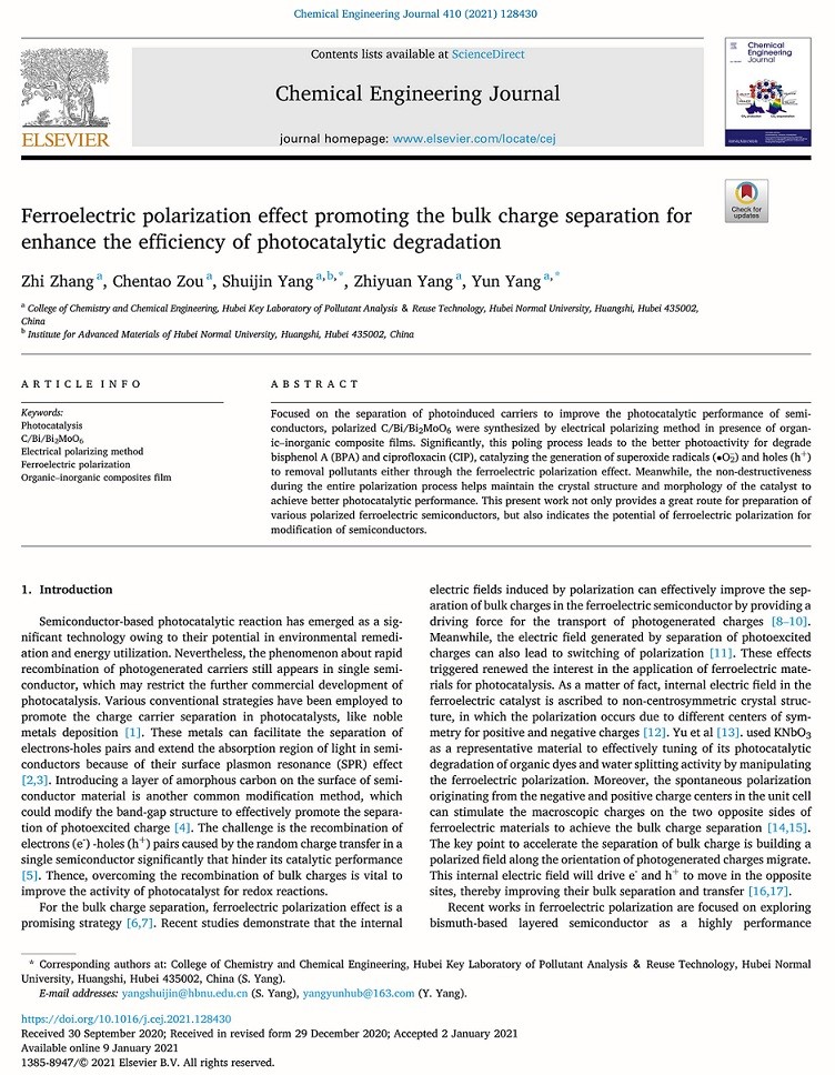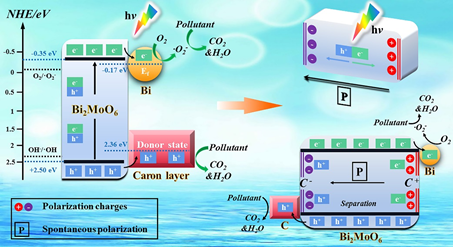 本文受啟發(fā)于極化促進(jìn)體內(nèi)電荷分離,選取具有鐵電性質(zhì)的Bi2MoO6作為合適的改性材料。首先,通過(guò)一步溶劑熱法引入碳層和半金屬Bi,對(duì)Bi2MoO6進(jìn)行傳統(tǒng)方法的改性,光催化降解環(huán)丙沙星(CIP)和雙酚A(BPA)的效率都能得到一定的提升。隨后,通過(guò)對(duì)其簡(jiǎn)便的電極化處理后,我們觀(guān)察到極化后催化劑的降解效率得到大幅度提升。通過(guò)XRD、FT-IR、SEM、TEM、DRS等分析,我們發(fā)現(xiàn)極化前后沒(méi)有明顯地改變催化劑的晶相和化學(xué)鍵組分、微觀(guān)整體形貌、禁帶寬度等。在不明顯改變催化劑的物理和化學(xué)等性質(zhì)的條件下而又能提高光催化性能,這有利于維持催化劑的整體性和穩(wěn)定性。另外,PFM分析證實(shí)了催化劑具有鐵電性質(zhì)和極化切換信號(hào)。最后,通過(guò)分析光催化反應(yīng)的中間產(chǎn)物,我們提出了一種可能的光催化電荷轉(zhuǎn)移機(jī)理,即傳統(tǒng)的改型手段只能促進(jìn)催化劑表面電荷的分離,體內(nèi)電荷會(huì)迅速的復(fù)合,從而限制了催化劑性能的提升。鐵電極化效應(yīng)會(huì)引起催化劑的自發(fā)極化電場(chǎng),因而能夠促進(jìn)體內(nèi)電荷的分離。我們聯(lián)用傳統(tǒng)方法(碳層和半金屬Bi的引入)和鐵電極化效應(yīng)共同地修飾催化劑,促進(jìn)其表面和體內(nèi)電荷的分離,使得催化劑的光催化性能得到明顯提升。
