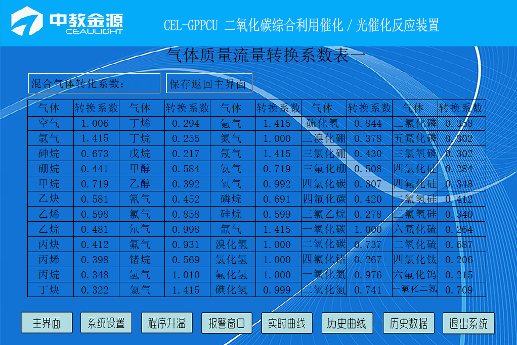 該裝置配有進料系統(tǒng),通入不同的氣體時,可在流量系數(shù)表選擇對應的流量系數(shù),實現(xiàn)氣體種類的多樣性和準確性。