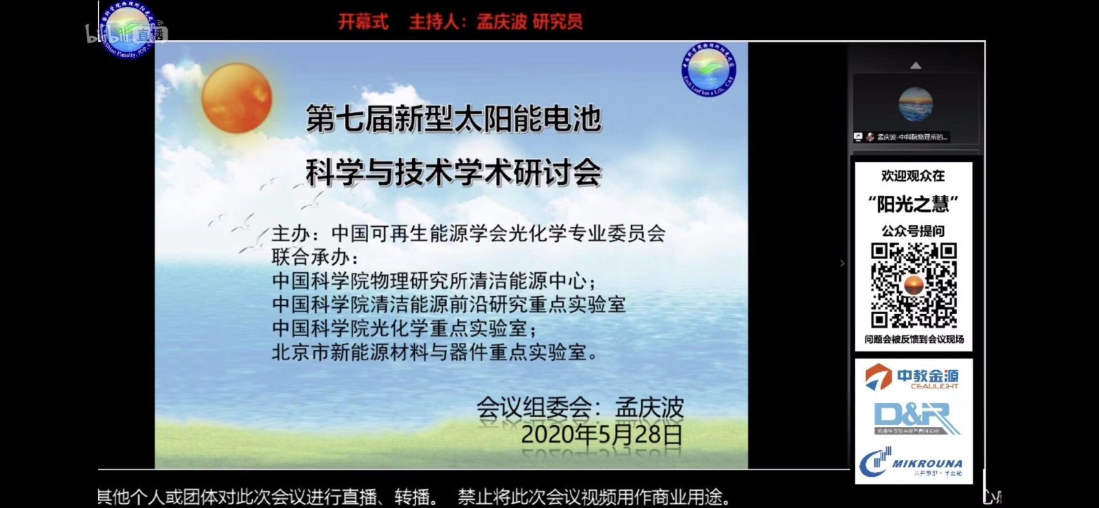 為促進(jìn)新型太陽能電池領(lǐng)域的交流和發(fā)展,中國可再生能源學(xué)會光化學(xué)專業(yè)委員會主辦,中國科學(xué)院物理研究所清潔能源中心、中國科學(xué)院清潔能源前沿研究重點(diǎn)實(shí)驗(yàn)室、中國科學(xué)院光化學(xué)重點(diǎn)實(shí)驗(yàn)室共同承辦的“第七屆新型太陽能電池科學(xué)與技術(shù)研討會”于2020年5月28日—29日召開!該系列會議秉承相互分享,相互學(xué)習(xí),相互交流的會議宗旨和非會議經(jīng)濟(jì)的理念,得到廣泛的認(rèn)同和支持。此次會議打破傳統(tǒng)的呈現(xiàn)方式,將以云端直播的方式進(jìn)行,成為本次會議的亮點(diǎn)!現(xiàn)場人氣值4.2萬人持續(xù)關(guān)注。在此中教金源預(yù)祝大會取得圓滿成功!