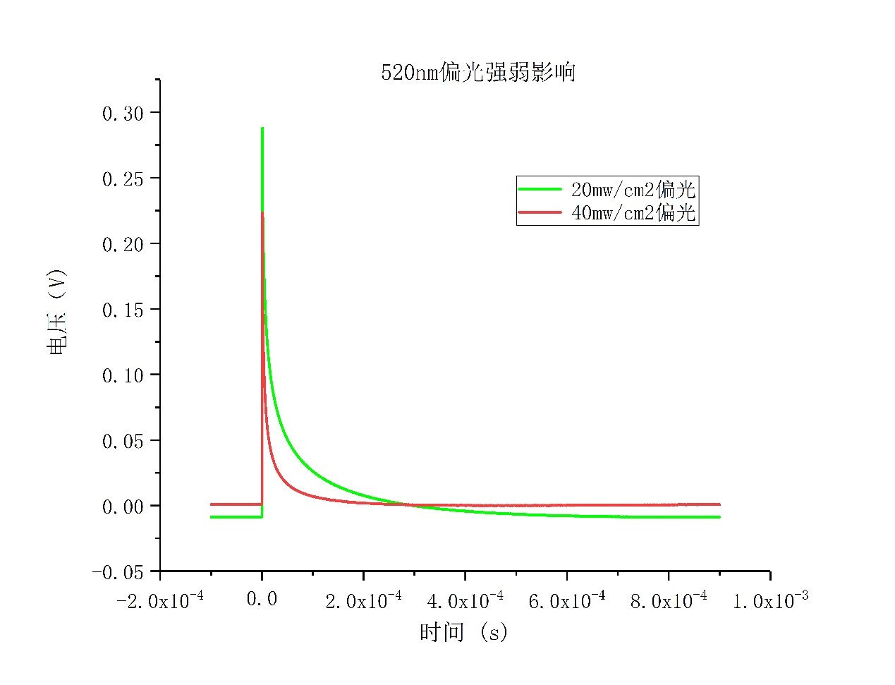 與穩(wěn)態(tài)光電壓對比,CdS粉末樣品響應(yīng)波段為300nm-600nm,我們可以得知,當(dāng)有樣品響應(yīng)波段的偏光照射時(shí),光強(qiáng)越強(qiáng)TPV壽命越小,峰值越小。但是如果樣品對偏光沒有響應(yīng)時(shí),則TPV信號不受偏光影響。