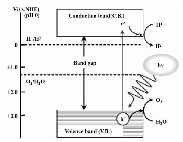 光降解水制氫氣指用光催化分解水制取氫。催化分解水制氫過程可分成光化學(xué)電池分解水制氫、半導(dǎo)體微顆粒催化劑的光催化分解水制氫和絡(luò)合催化法光解水制氫。因為光直接分解水需要高能量的光量子(波長小于190 nm),從太陽輻射到地球表面的光不能直接使水分解,所以只能依賴光催化反應(yīng)過程。光催化是含有催化劑的反應(yīng)體系,在光照下,激發(fā)催化劑或激發(fā)催化劑與反應(yīng)物形成的絡(luò)合物而加速反應(yīng)進(jìn)行的一種作用。當(dāng)催化劑和光不存在時,該反應(yīng)進(jìn)行緩慢或不進(jìn)行。