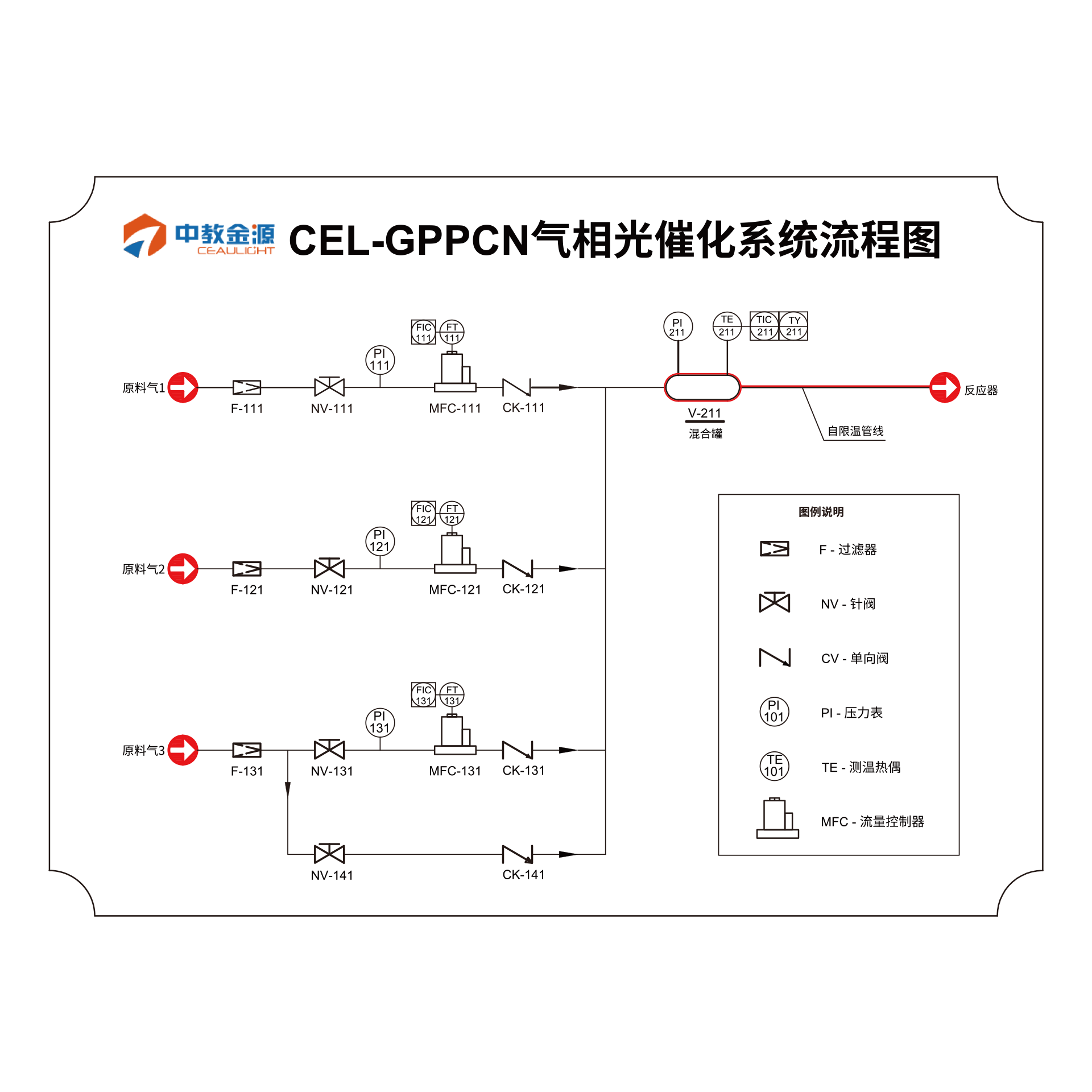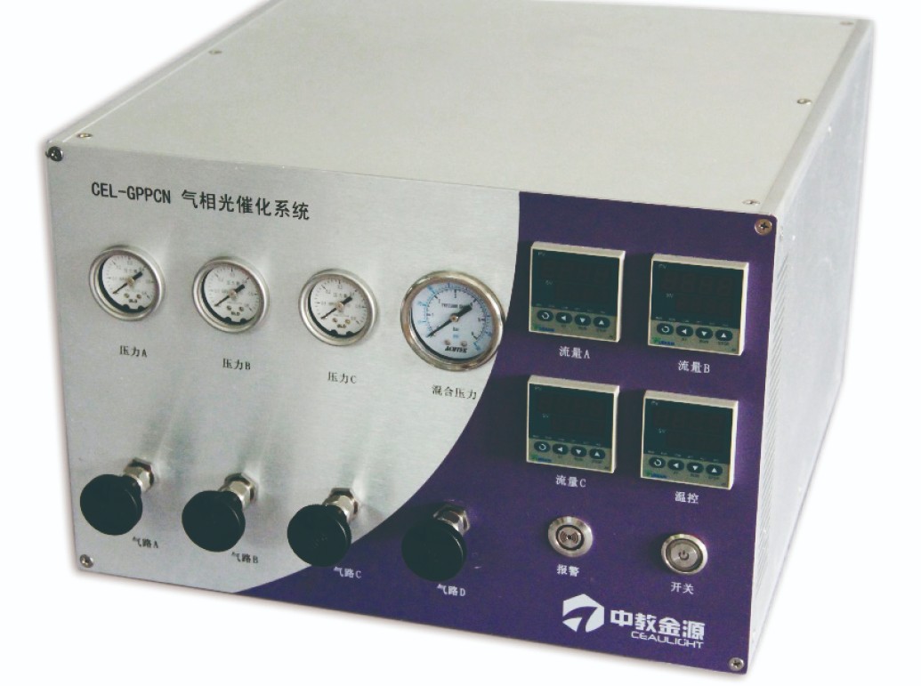 CEL-GPPCN 氣相光催化系統(tǒng)可以實現(xiàn)多路氣體的配氣混合,采用質量流量計按需求實現(xiàn)任意氣體配比,氣體混合室及管路控溫(<200℃),出口管線采用自限溫度管線。系統(tǒng)采用多路配氣系統(tǒng),多級混合反應,耐壓的全不銹鋼管路,反應部分按需求配置各種混合釜,反應釜,反應器,光催化反應器,實現(xiàn)相應的光催化實驗。