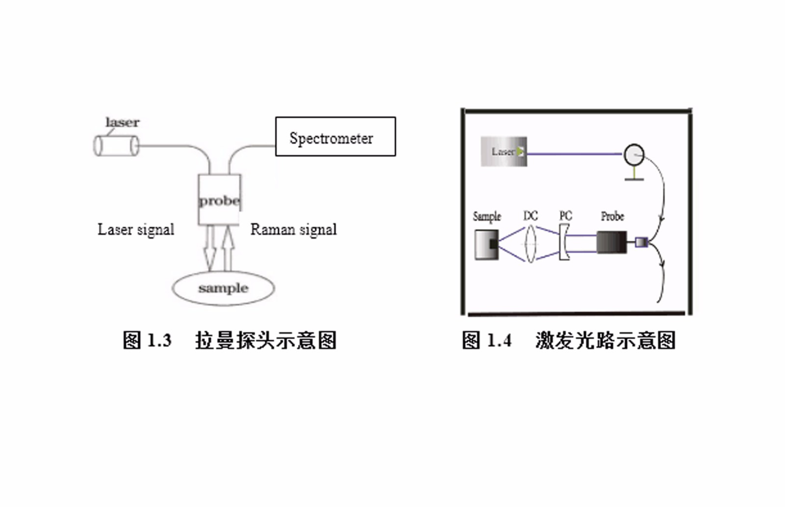 CEL-BRS由公司自主研發(fā),以“納秒脈沖激光+2DSPC?納秒門(mén)控單光子相機(jī)為核心,基于時(shí)間選通的遠(yuǎn)程在線拉曼測(cè)試系統(tǒng)。主要包括激光激發(fā)和拉曼檢測(cè)兩部分。激光激發(fā),本系統(tǒng)采用被動(dòng)調(diào)Q脈沖微片,波長(zhǎng)532nm,脈沖能量40uJ,重復(fù)頻率2.5KHz,脈沖寬度<1ns的激光器,通過(guò)光路整形,將激光耦合進(jìn)入光纖拉曼探頭,使光斑聚焦于檢測(cè)的樣品。探頭原理示意如圖1.3所示,激光光路示意圖如圖1.4所示。