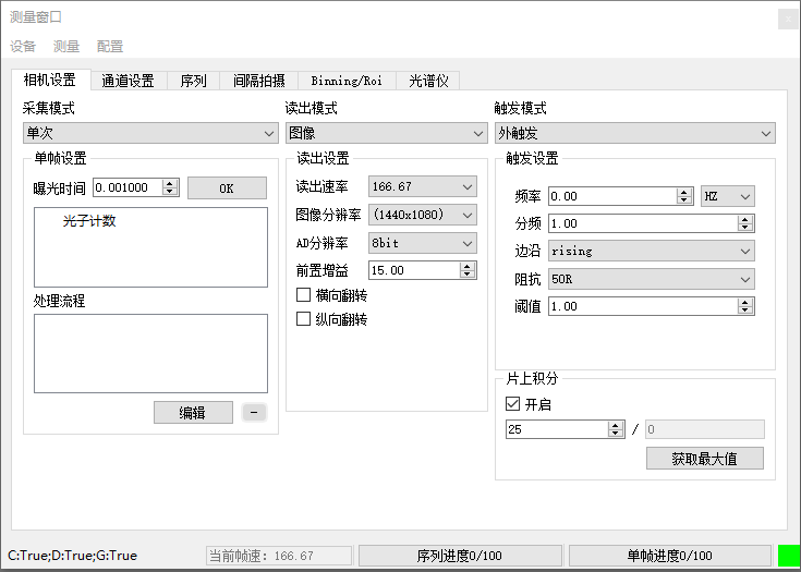 參數(shù)設(shè)置好,點(diǎn)擊標(biāo)題欄的<單幀>按鈕,軟件出現(xiàn)單幀采集界面,如下圖3.15所示。單幀模式適合單次測(cè)量,實(shí)時(shí)觀察樣品信號(hào)。