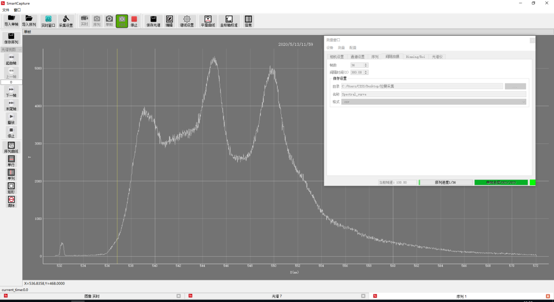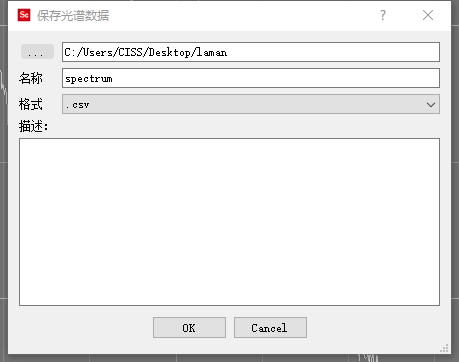 在單幀模式采集時(shí),數(shù)據(jù)保存需要手動(dòng)點(diǎn)擊<保存光譜>,保存當(dāng)前窗口數(shù)據(jù)。如下圖4.1所示。保存的數(shù)據(jù)格式有:.csv,.cie